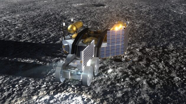 An artist’s conception shows Astrolab’s FLIP rover on the moon. Interlune plans to put a helium-hunting multispectral camera on the rover. (Astrolab Illustration)…